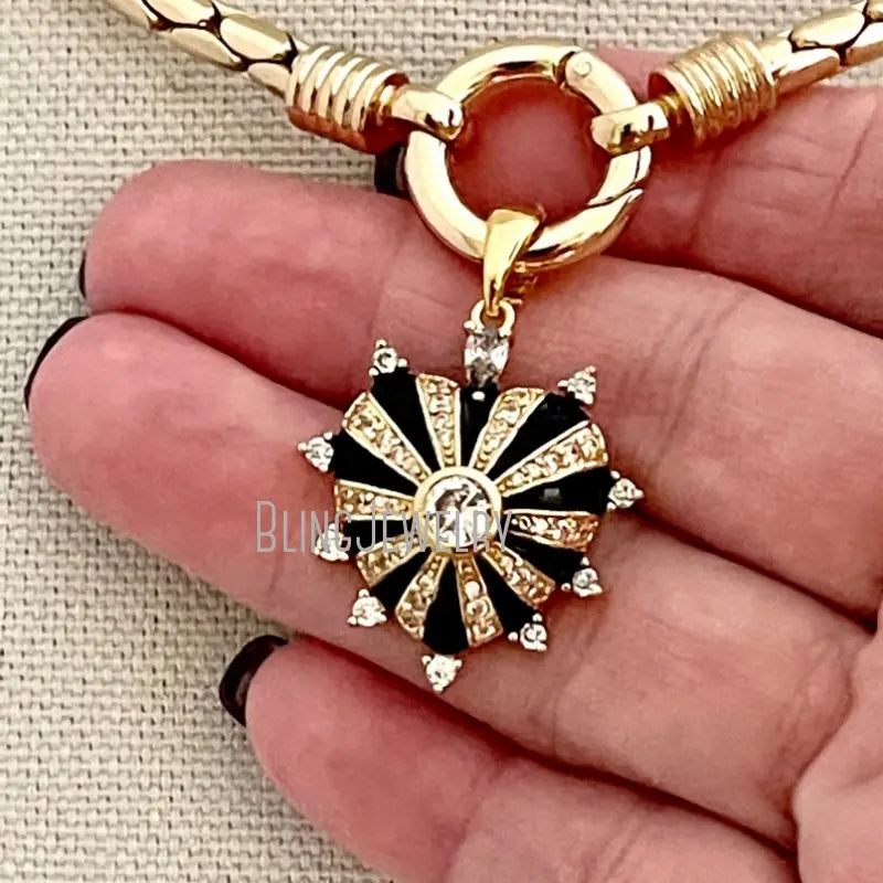 16" 18k Gold Plated Boa Snake Chain Necklace with a Matching Cpring ring Clasp and Black Heart Enamel Pendant