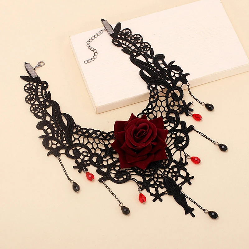 1PCS Vintage Punk Flower Charm Pendant Choker Necklace For Women Gothic Lace Tassel Clavicle Chain Jewelry