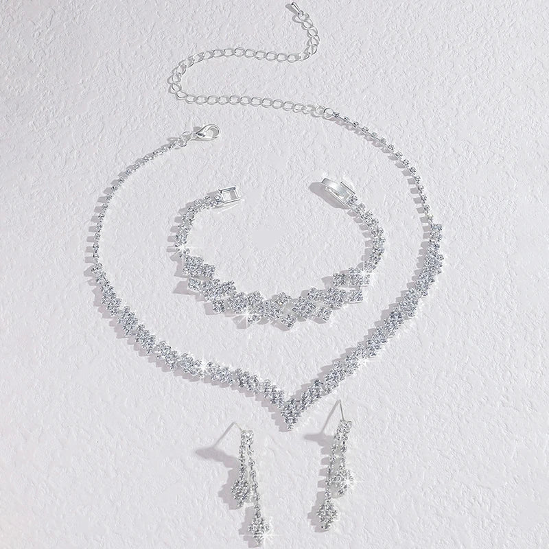 1Set Geometric Rhinestone Necklace Earrings Bracelet Kit Wedding Bride Jewelry Set Simple Tassel Sparkling Jewelry Set Gifts