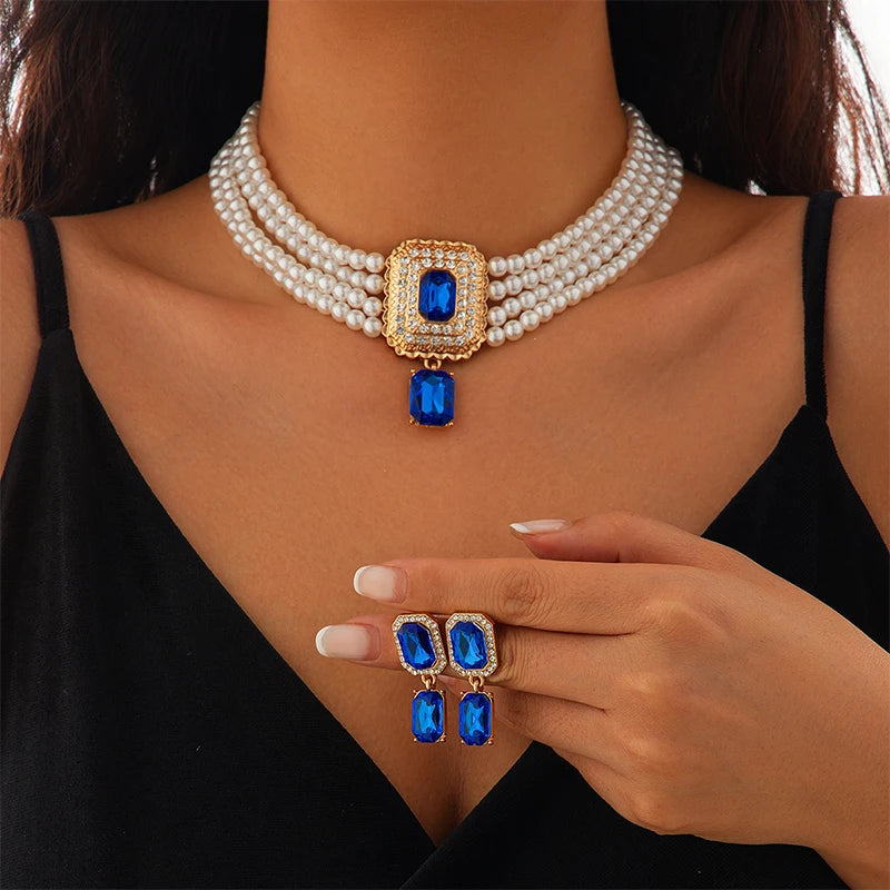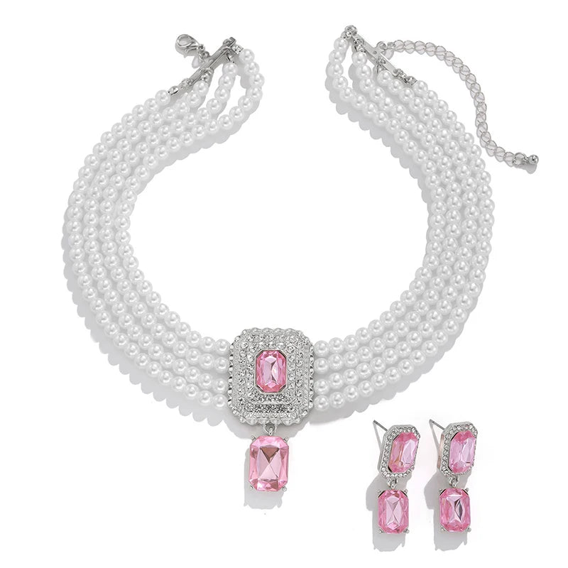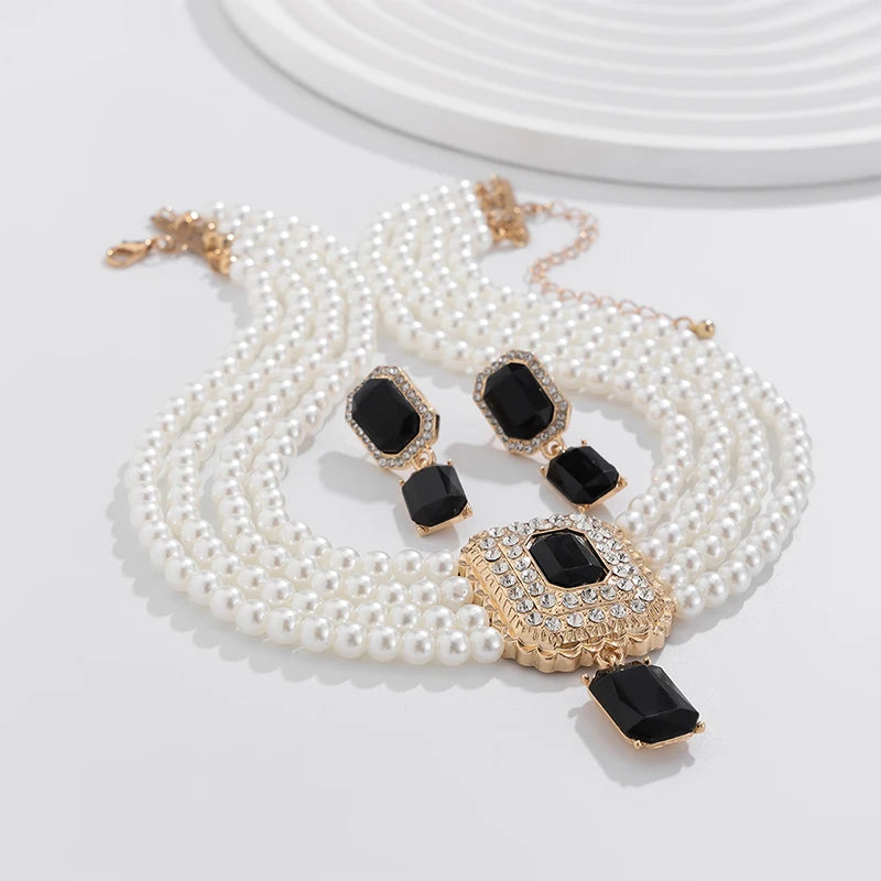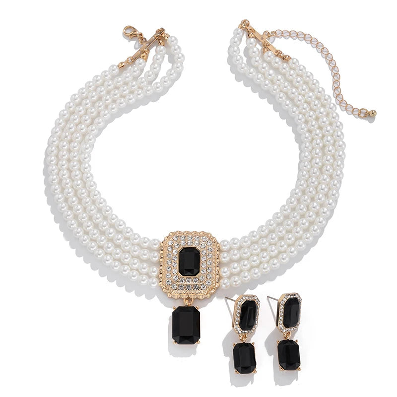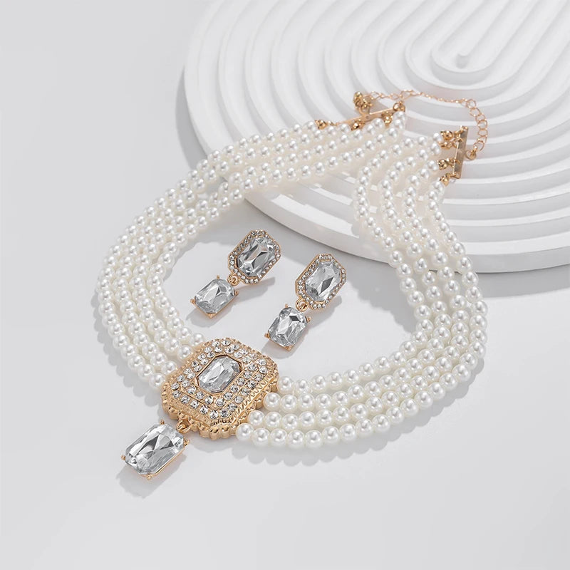 1Set Luxury Multilayer Imitation Pearl Necklace Earrings For Women Girls Temperament Jewelry Bridal Rhinestone Wedding Jewelry