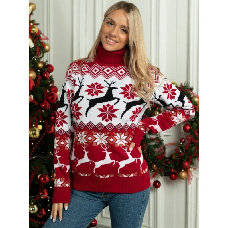 2024 Autumn And Winter Christmas Couple Sweater Casual Elk Jacquard Design Long Sleeve High Collar Loose Pullover Home Clothing