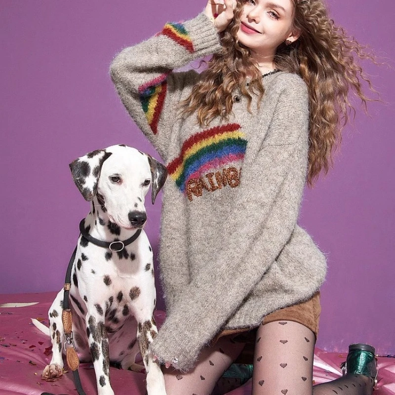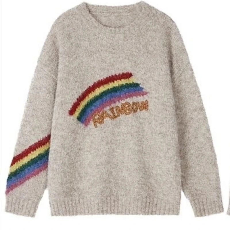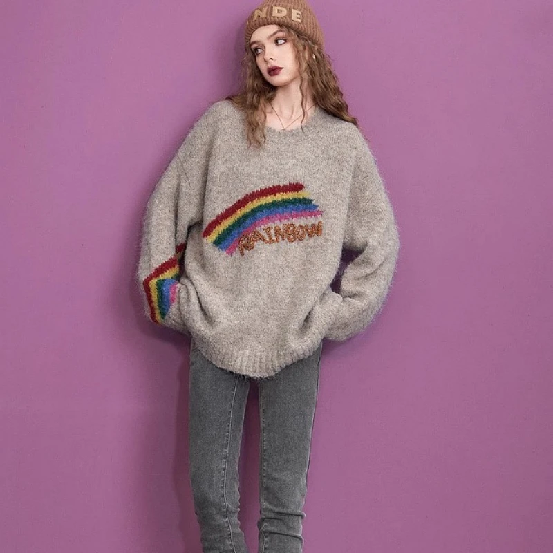 2024 New In Autumn Winter Christmas Rainbow Khaki Pullover Sweater For Women Knitwear Long Sleeves Warm Loose Top Clothes