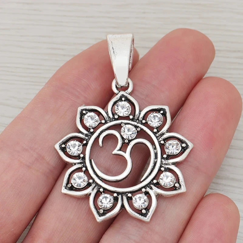 5 x Tibetan Silver OM AUM Crystal Rhinestone Yoga Lotus Flower Charms Pendants for DIY Necklace Jewellery Making Accessories