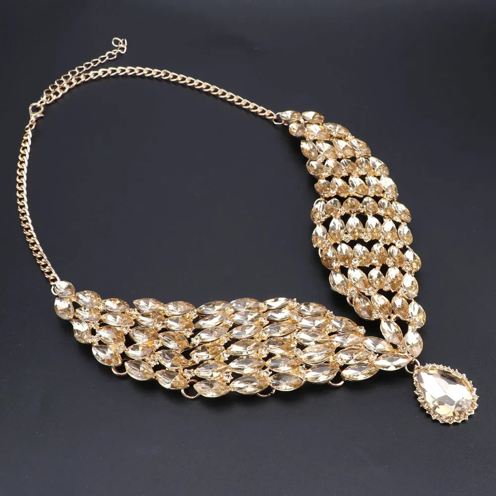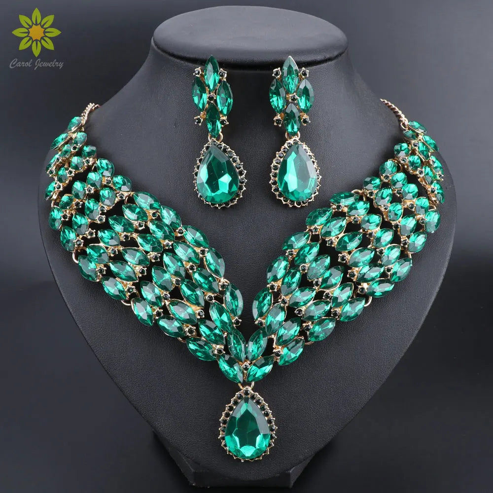 New Green Crystal Statement Necklace Earrings Set Gold Color Jewelry Sets Indian Bridal Wedding Costume Jewellery