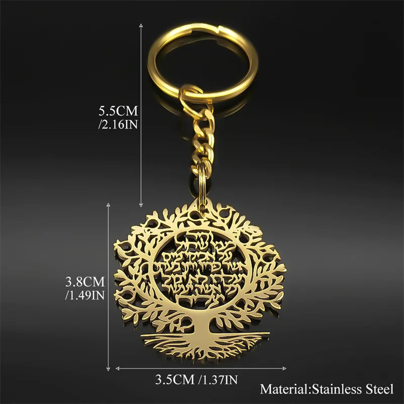 Tree of Life Hebrew Pendant Key Chain for Women Men Stainless Steel Gold Color Israel Jewish Hollow Drop Key Ring Amulet Jewelry
