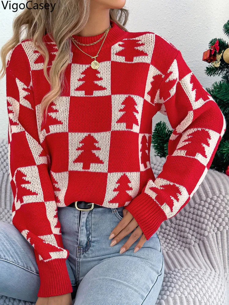 VigoCasey 2025 Autumn Winter Lady Christmas Knitted Sweater Women O Neck Plaid Print Pullover Lantern Long Sleeve Loose Jumper