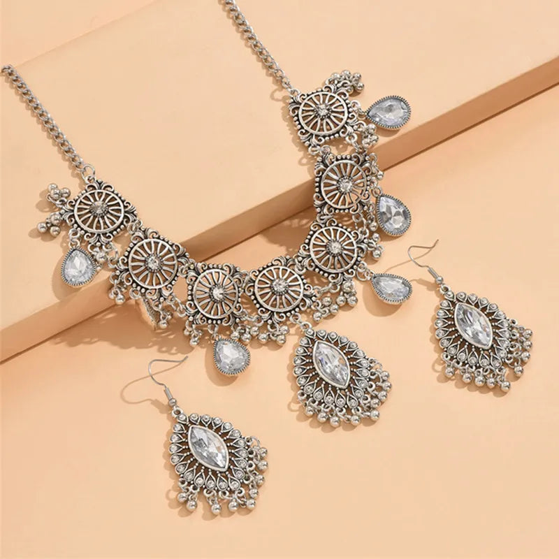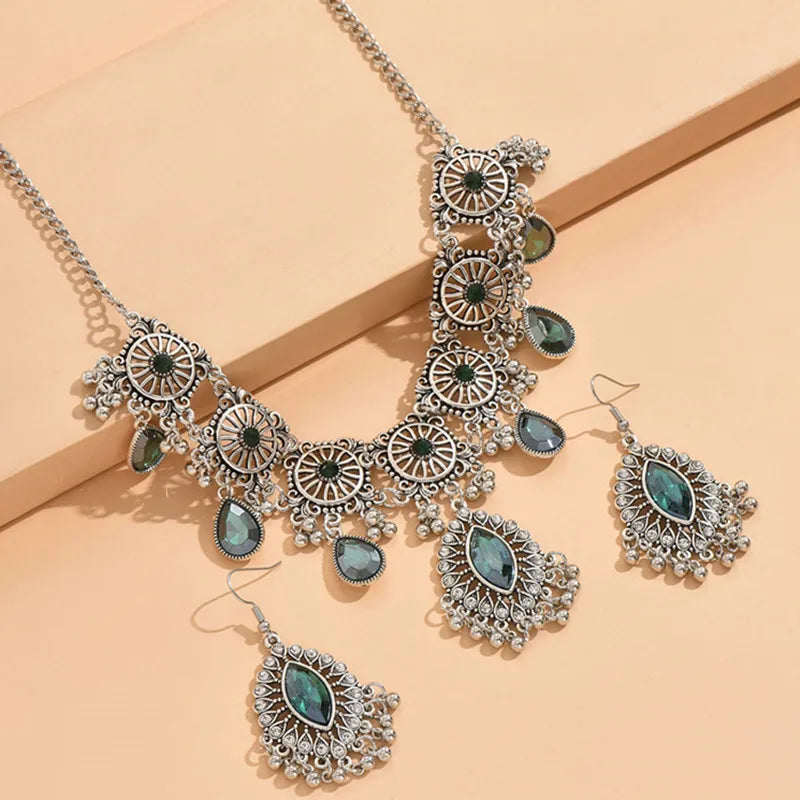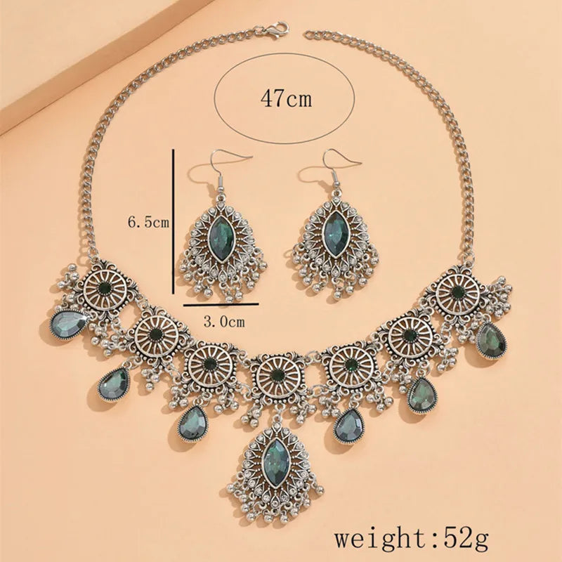 Vintage Ethnic Jewelry Set For Woman Resin Stone Jewelry Sets Hollow Metal Water Drop Necklace Earrings Set For Women