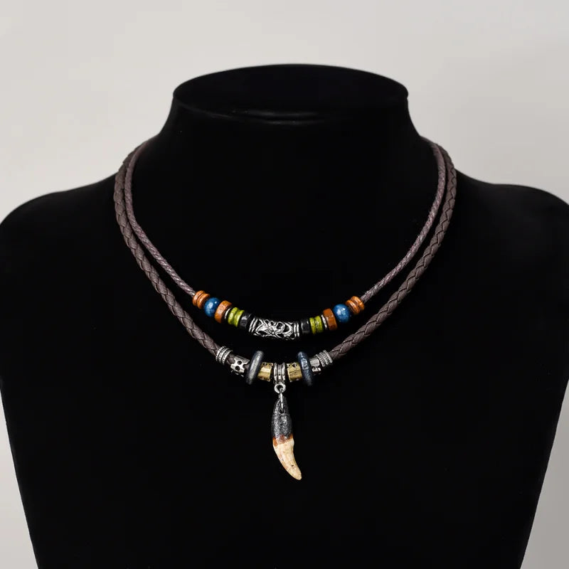 Vintage Men's Wolf Tooth Pendant Necklace Double Layer Leather Rope Necklaces Ancient Tribe Prayer Beaded Choker Charm Chains