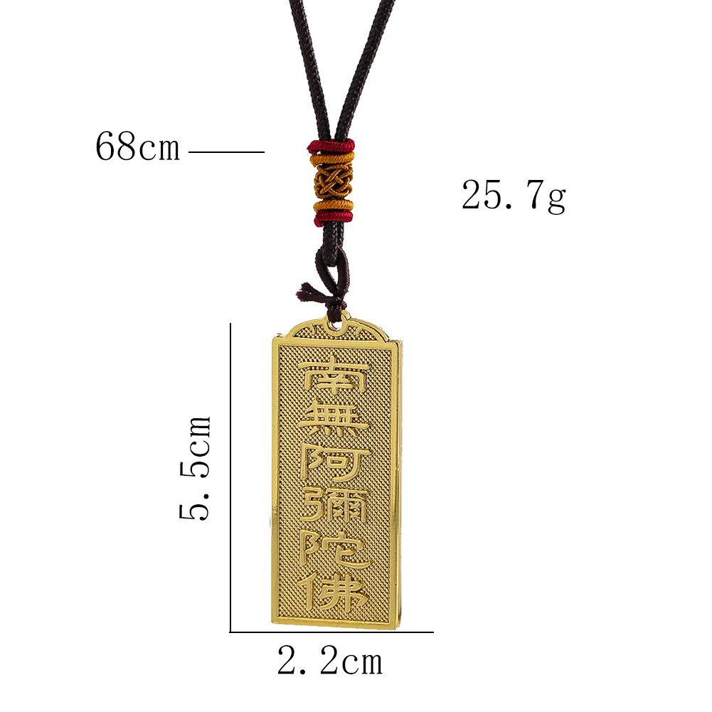 The pendant is made from high-quality metal, engraved with the sacred Amitabha Buddha mantra, a symbol of peace, protection, and good fortune. The 68cm long cord and 25.7g pendant make this necklace comfortable to wear, while the 2.2cm x 5.5cm pendant size offers an elegant balance of visibility and subtlety.