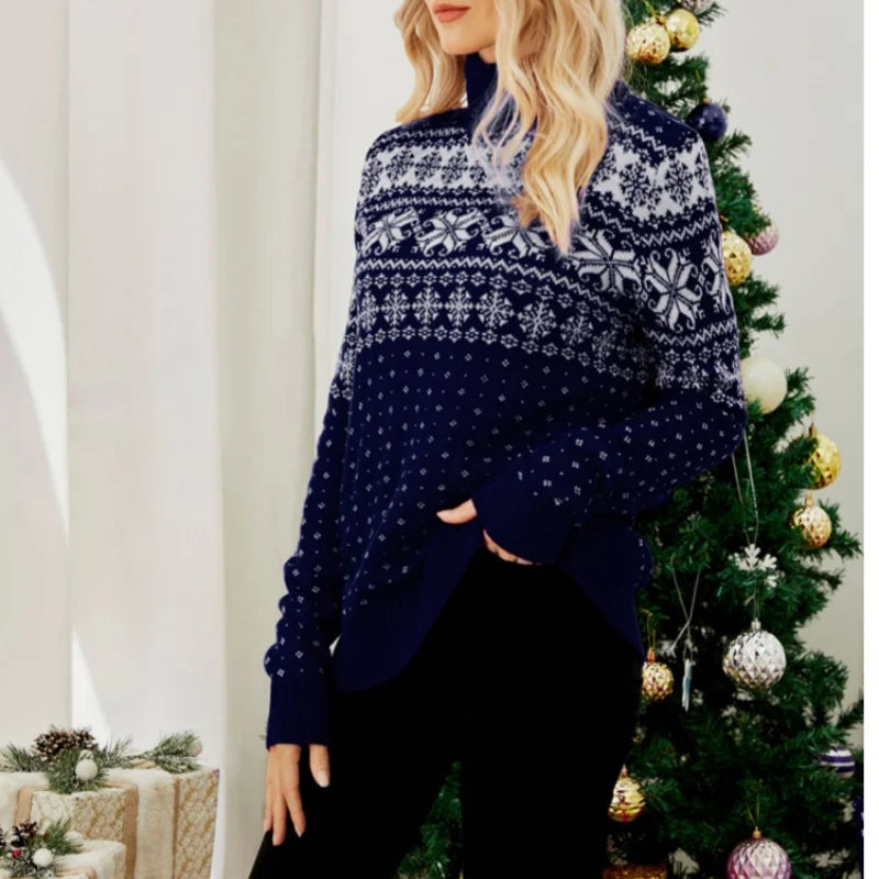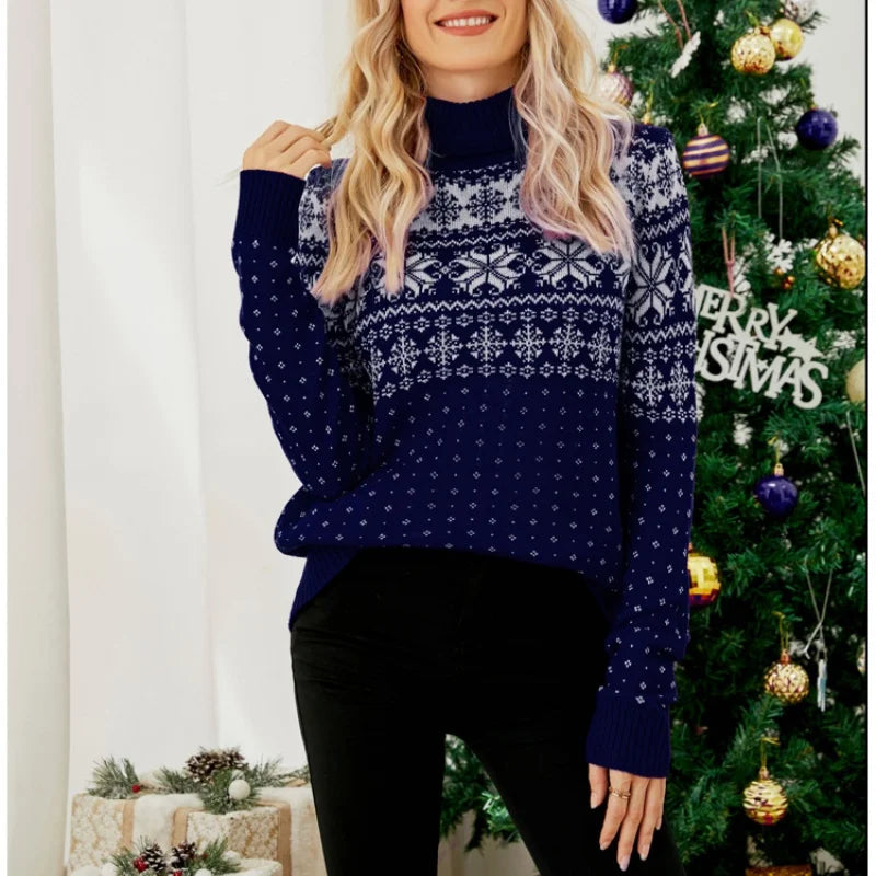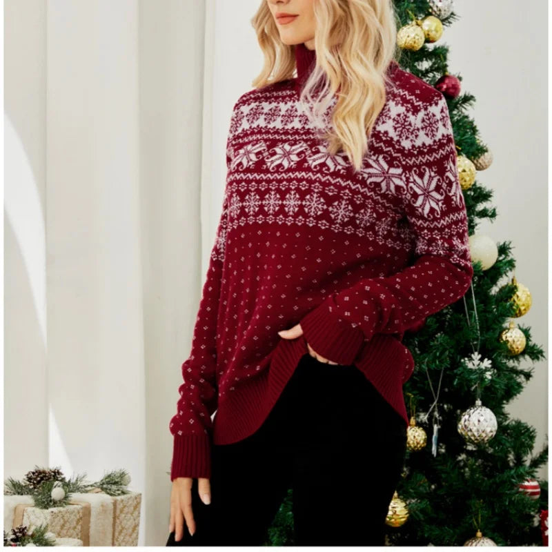 Winter 2025 Women's Christmas Sweater Full Sleeve Turtleneck Knitted Jumpers Soft Loose Jacquard Pullover Tops Female Xmas Look