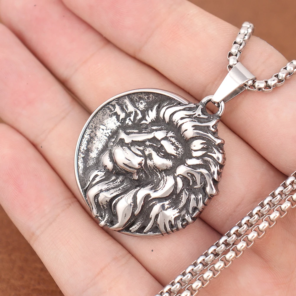 Name: Wolf & Lion Pendant Necklace with Norse Runes Vintage Style Viking Tribal Chain for Men, Punk Biker Stainless Steel Jewelry Gift