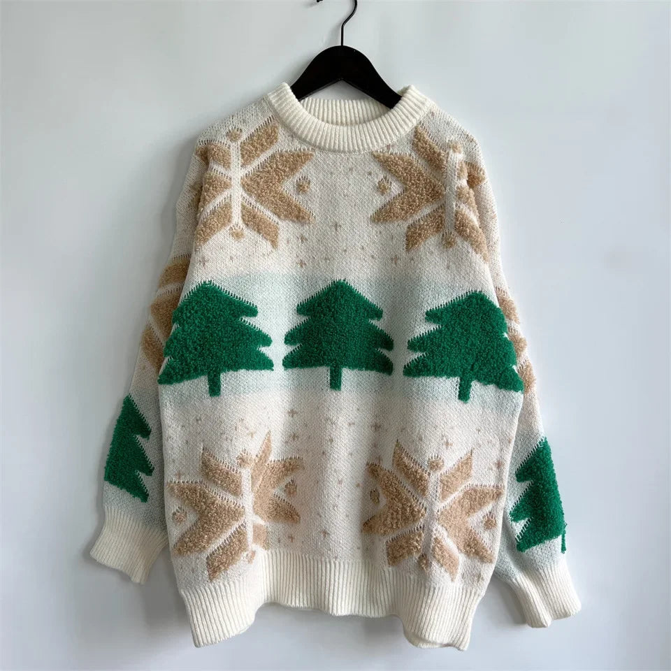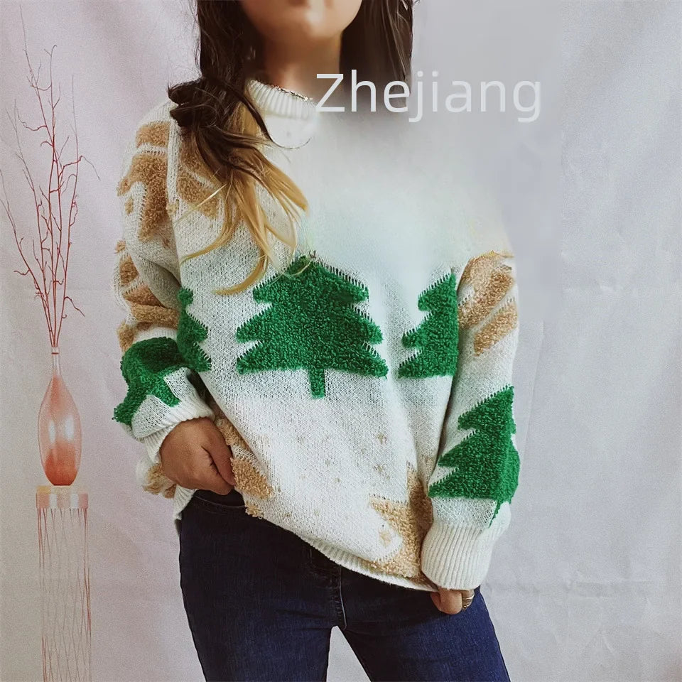 Women's Jacquard Round Neck Long Sleeve Thickened Knit Pullover Christmas Tree Design Autumn/winter New Style Sweater