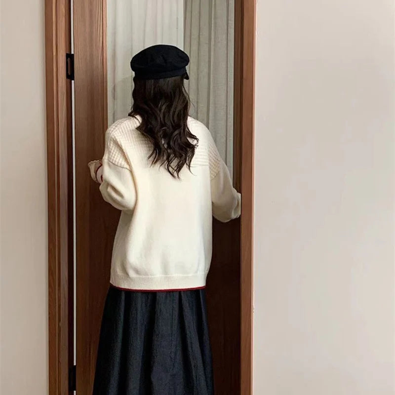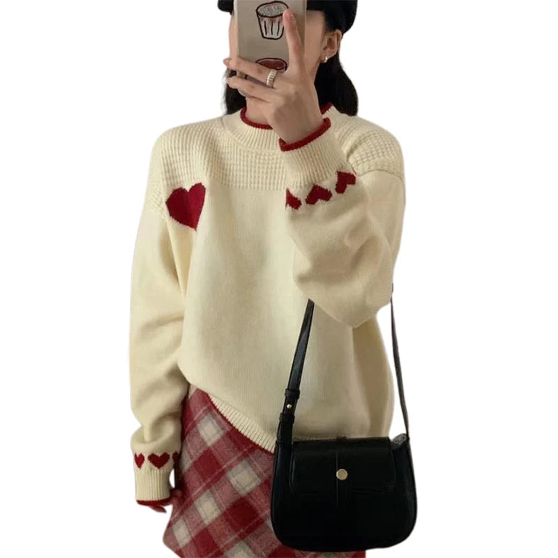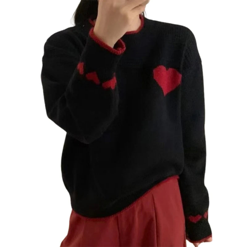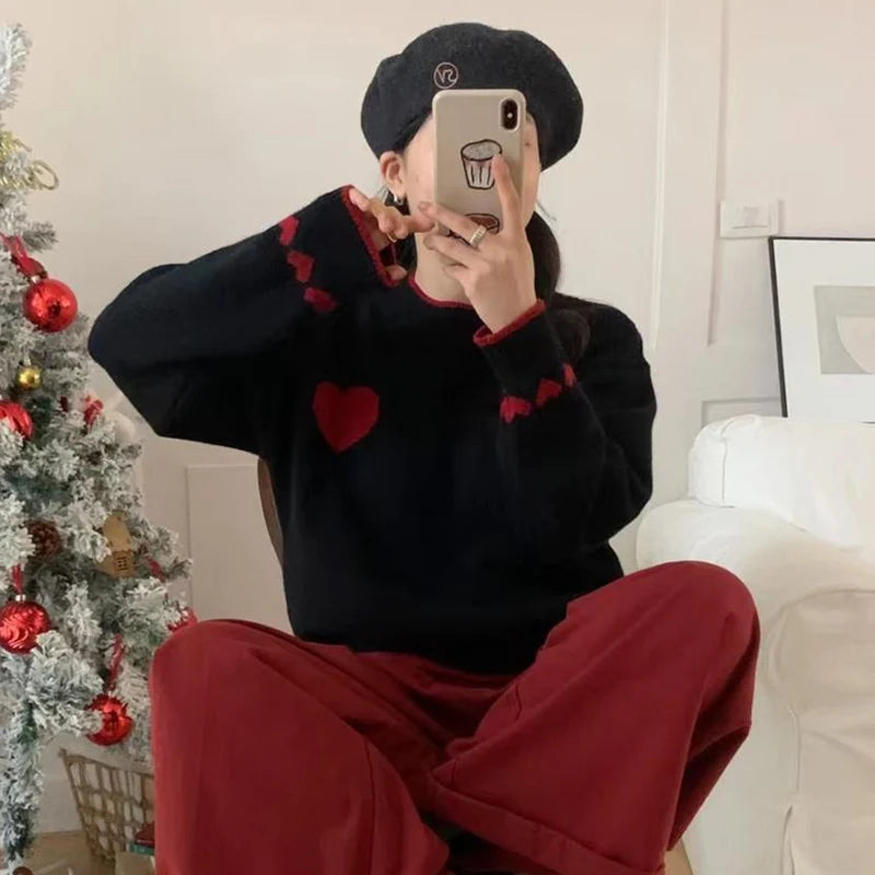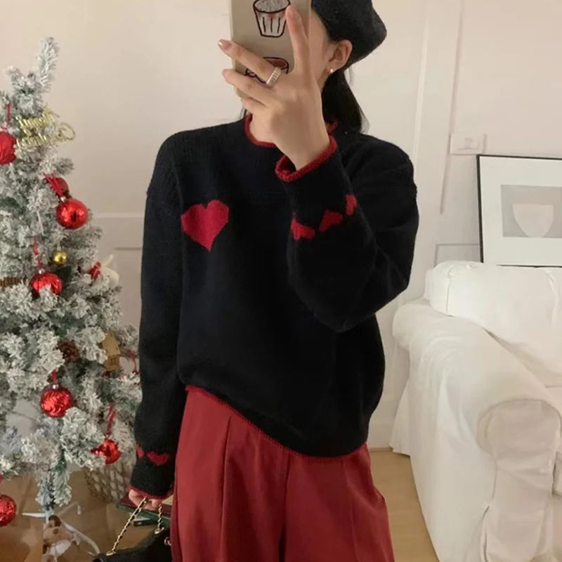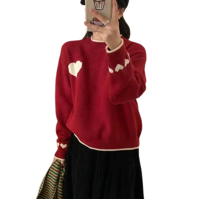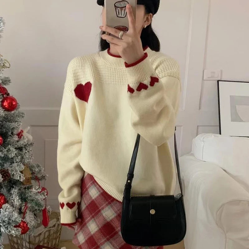 Xingqing Christmas y2k Sweaters Women Clothes Heart Print Round Neck Long Sleeve Knitted Pullover Tops 2000s Aesthetic Clothing